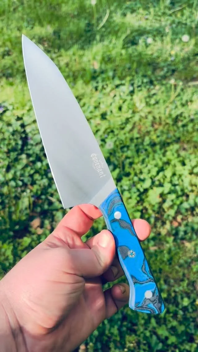 A premium chef's knife with a wooden handle in a foam-padded white box.